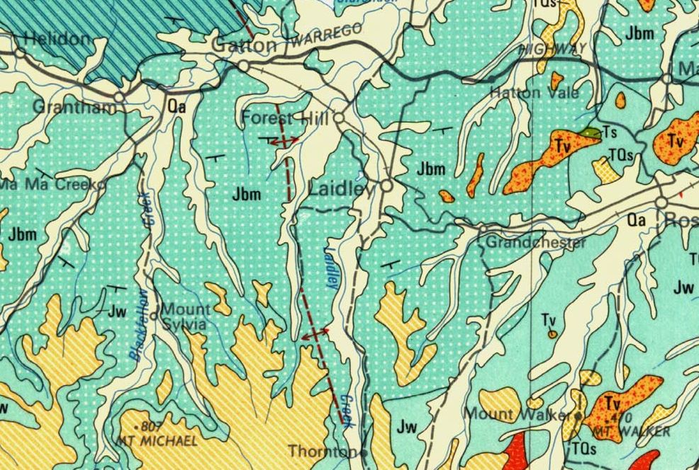 Extract from Moreton geological map for area west of Brisbane near Laidley. Width approximately 50 km